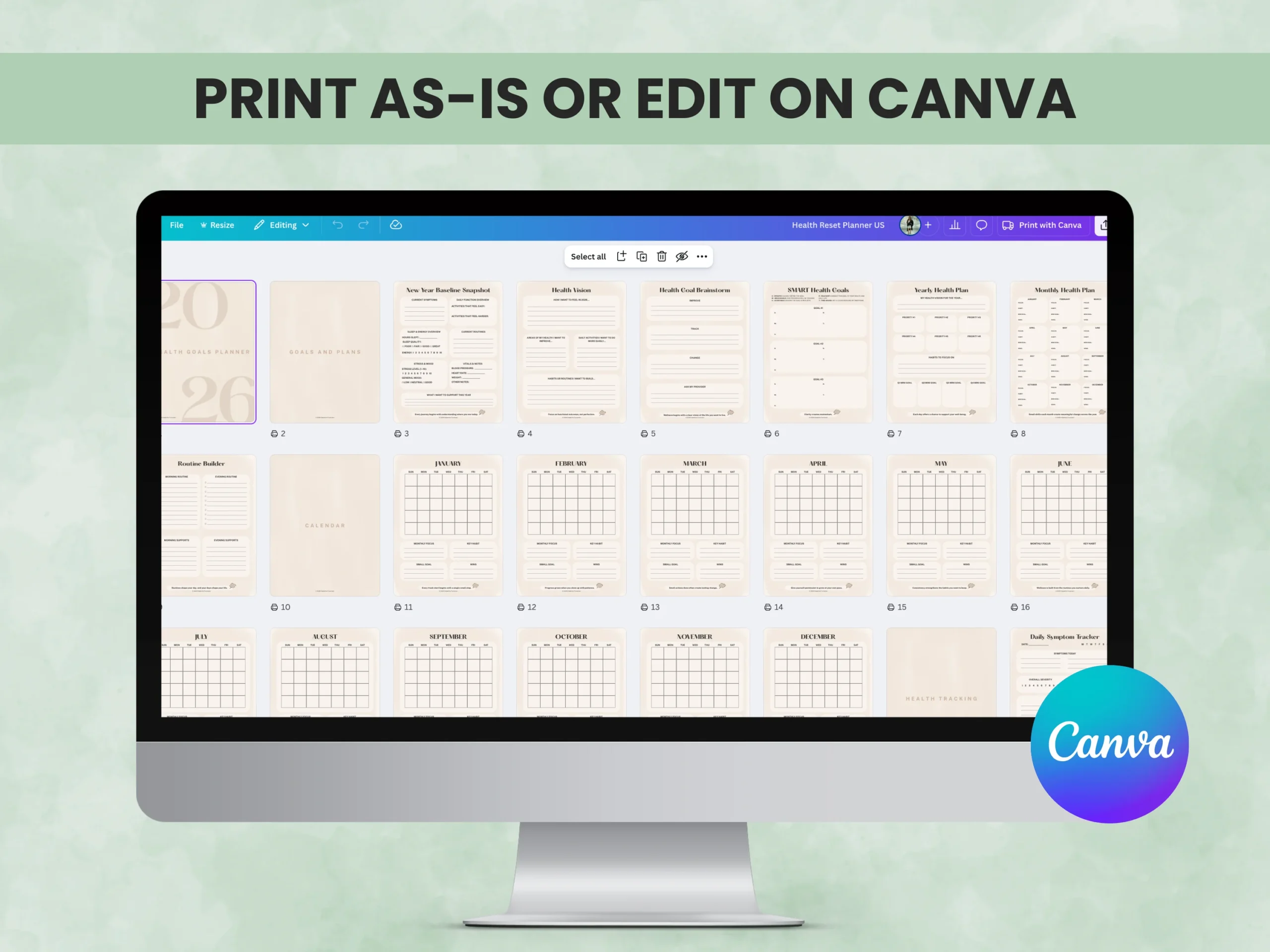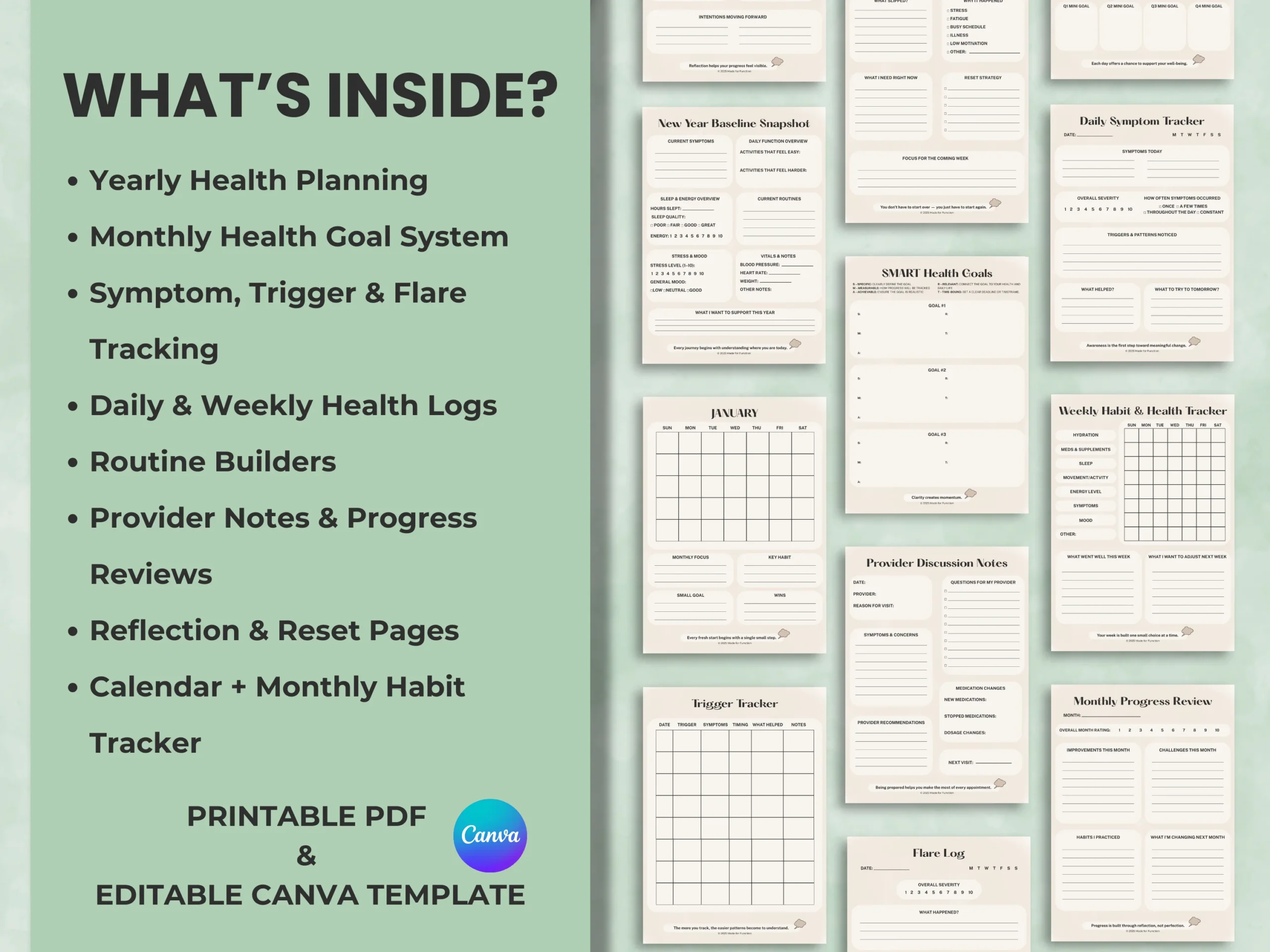 This printable and editable 2026 Health Reset Planner helps you keep your health information, symptoms, routines, and goals in one easy-to-use system — from daily logs and monthly calendars to flare tracking, habit building, and appointment notes. It’s perfect for chronic illness management, wellness planning, neurodivergent adults, or anyone looking for a structured way to organize their health for the new year.