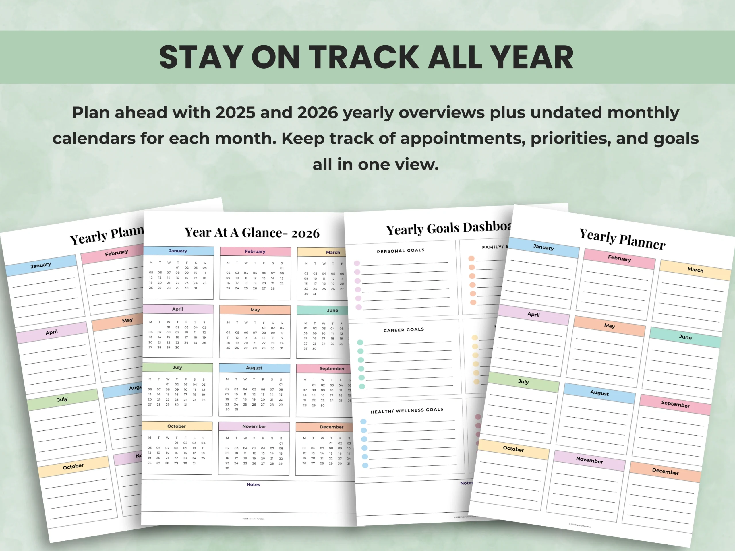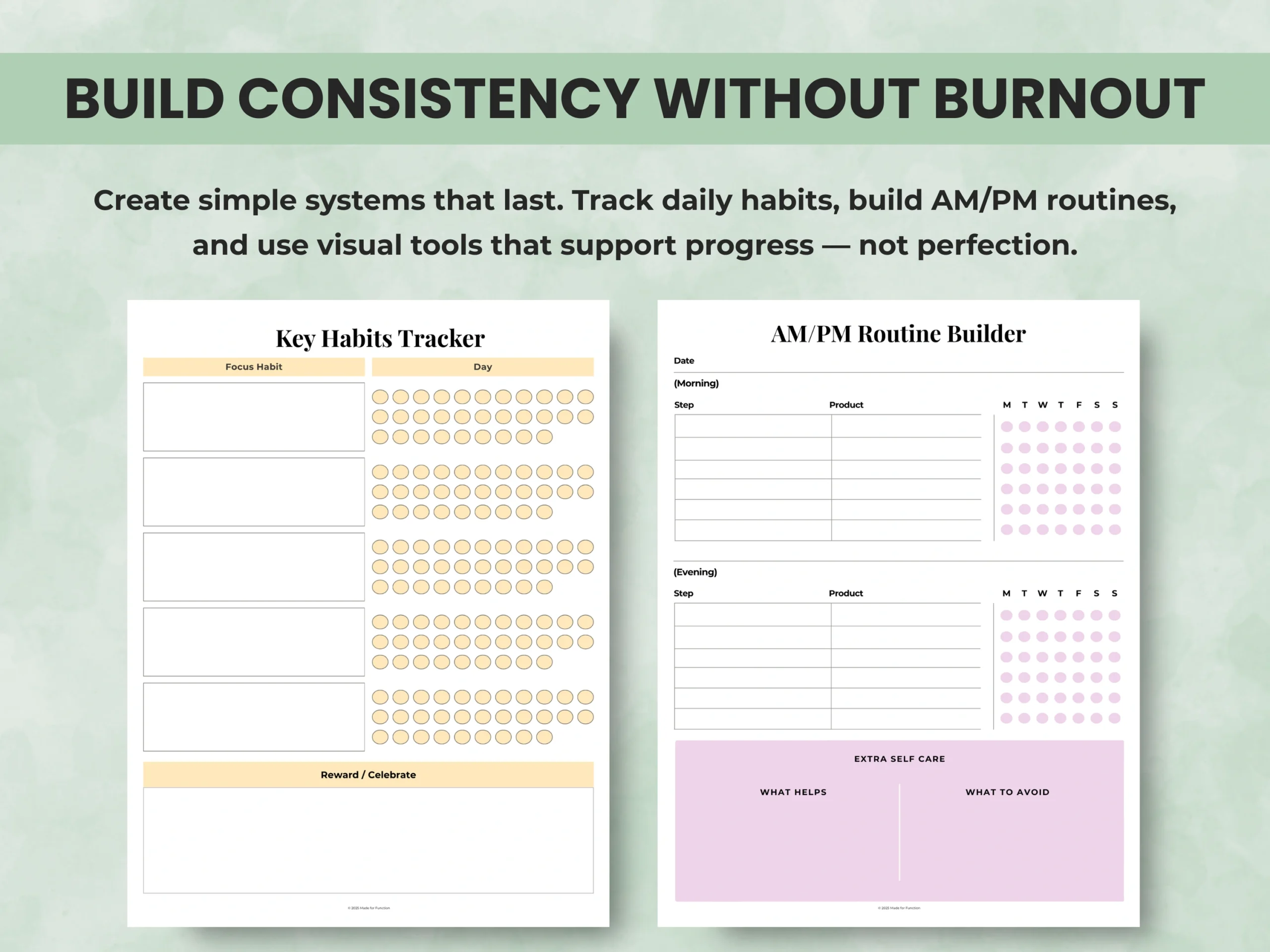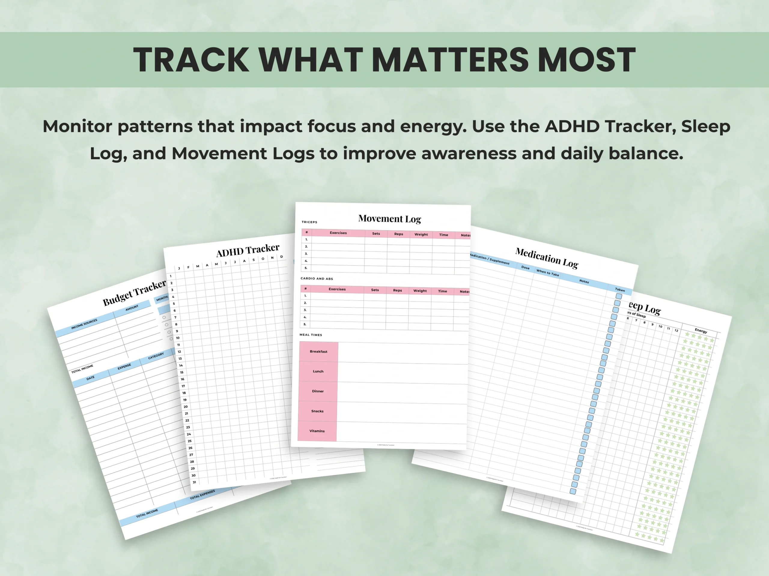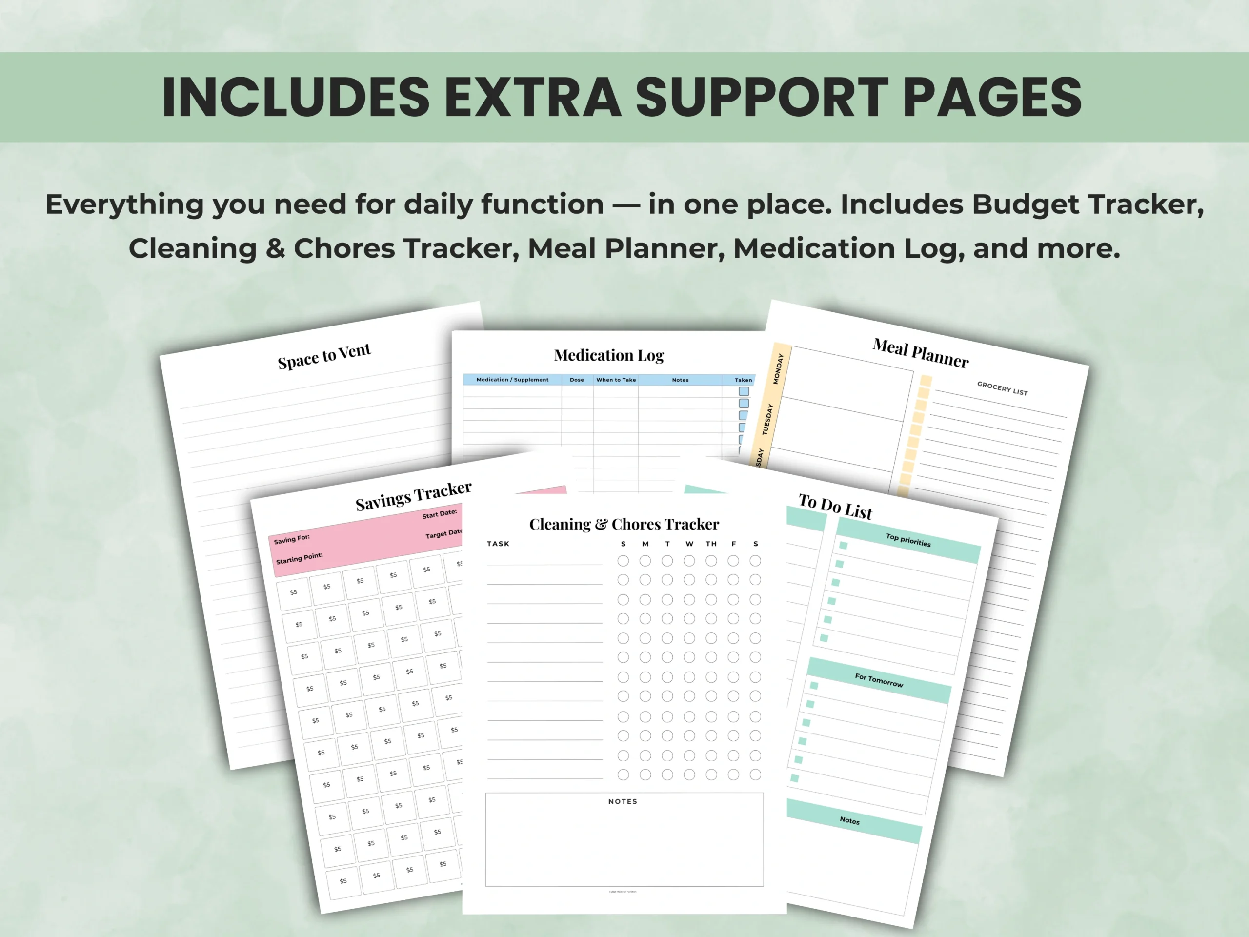 • Bonus support tools: Budget Tracker, Meal Planner, Cleaning Tracker, and Medication Log