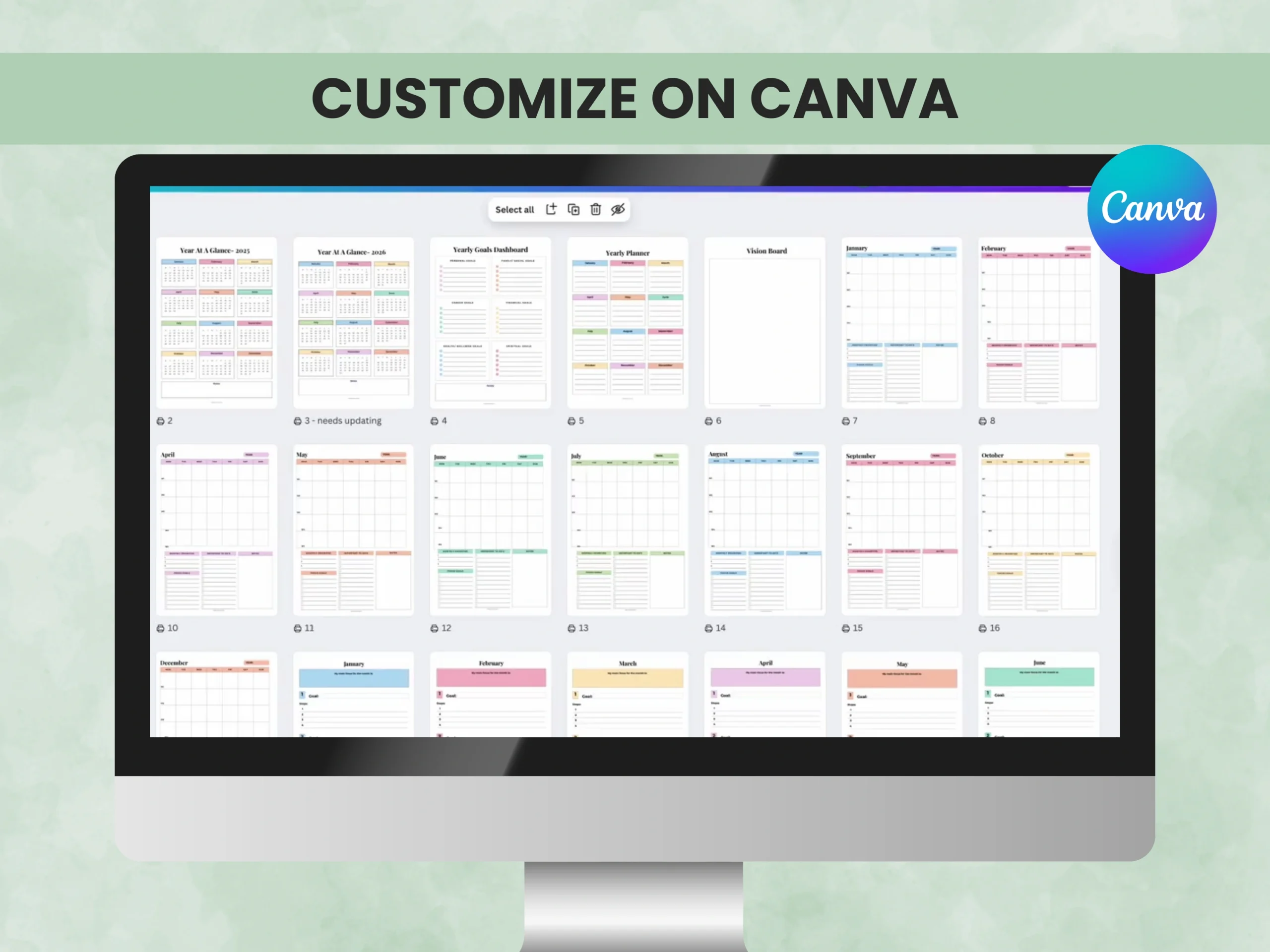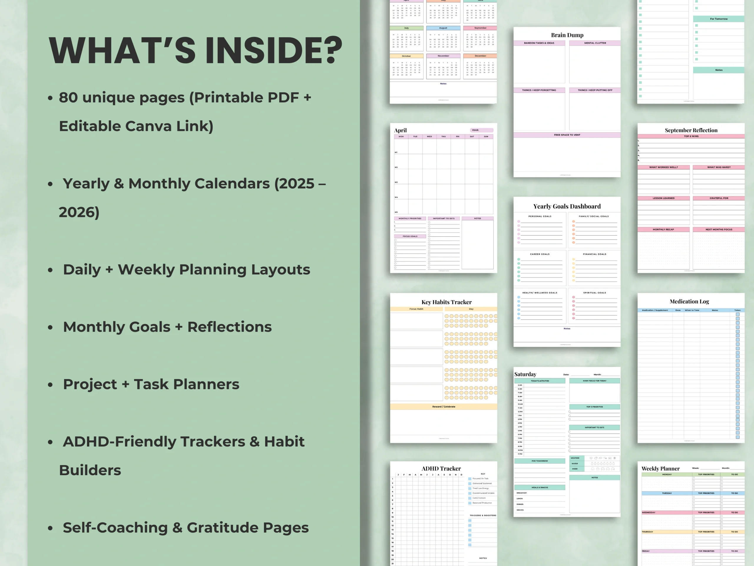 • 80 unique planner pages (printable PDF + editable Canva template)