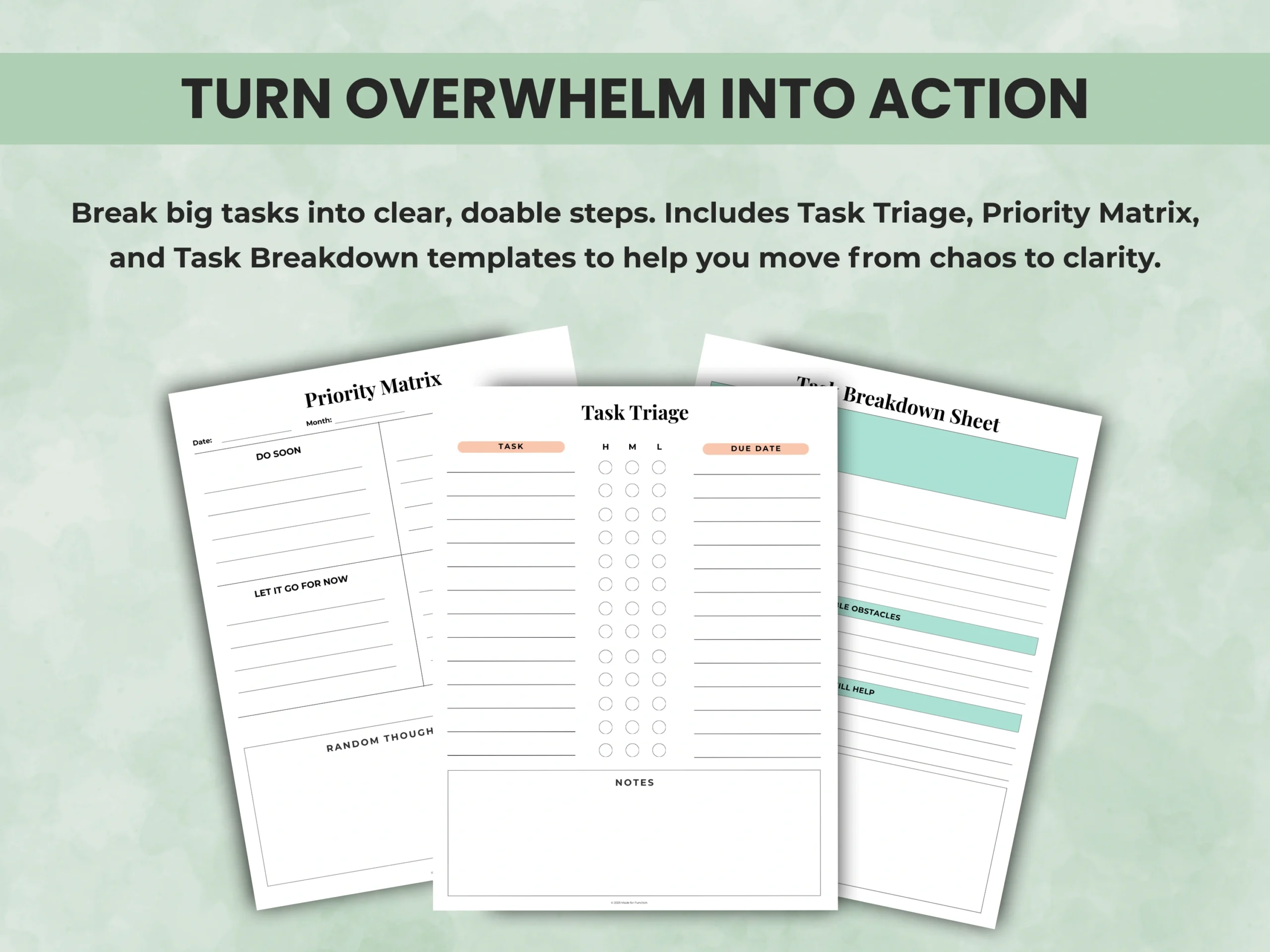 • Task Triage, Priority Matrix, and Task Breakdown sheets