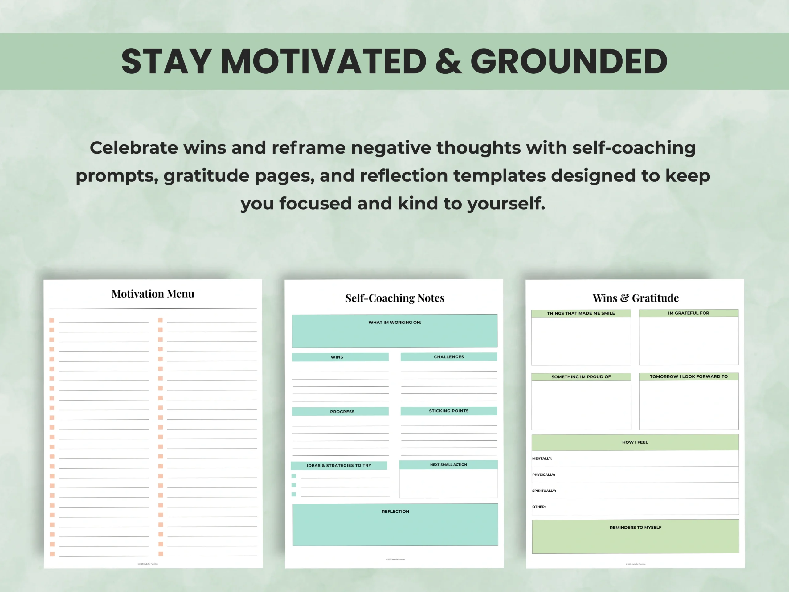 • Self-Coaching, Gratitude, and Wins reflection pages