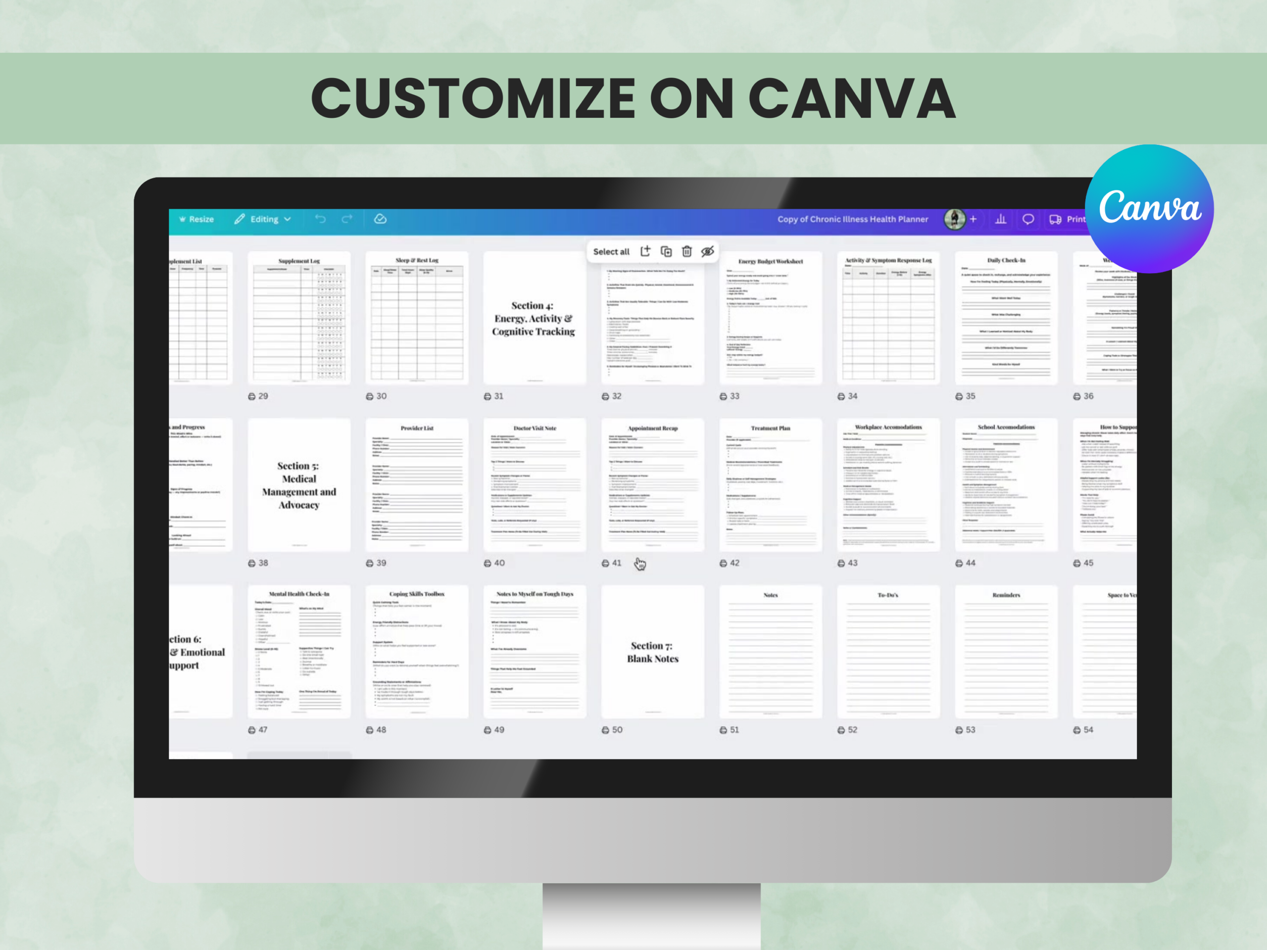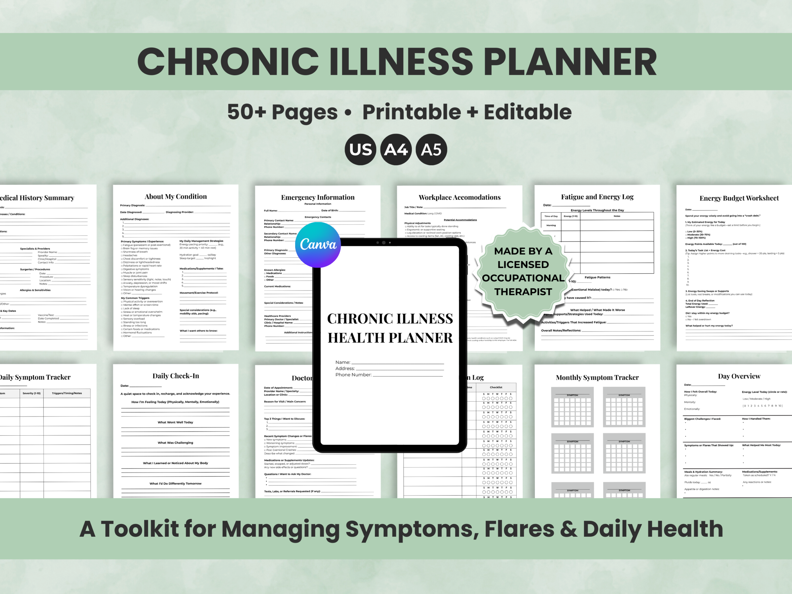 Chronic Illness Health Planner printable & editable Canva template — created by a licensed occupational therapist to make managing symptoms and medical details easier. This 50+ page planner helps you track flares, fatigue, pain, and health logs while keeping organized records for appointments. Great for caregivers, chronic illness tracking, spoonie health logs, and ADHD-friendly planning.