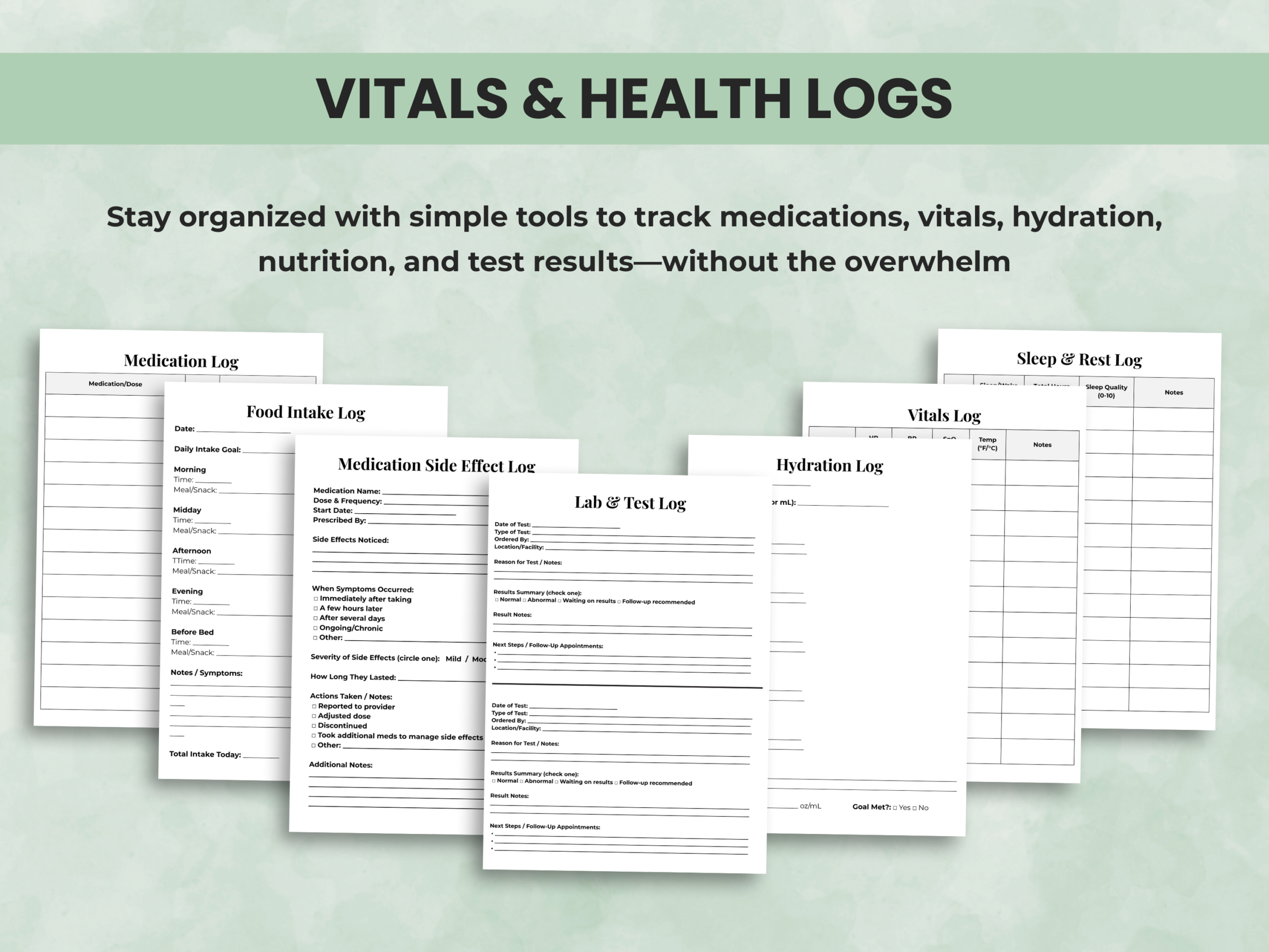 • Vitals, meds, supplements, hydration & food logs