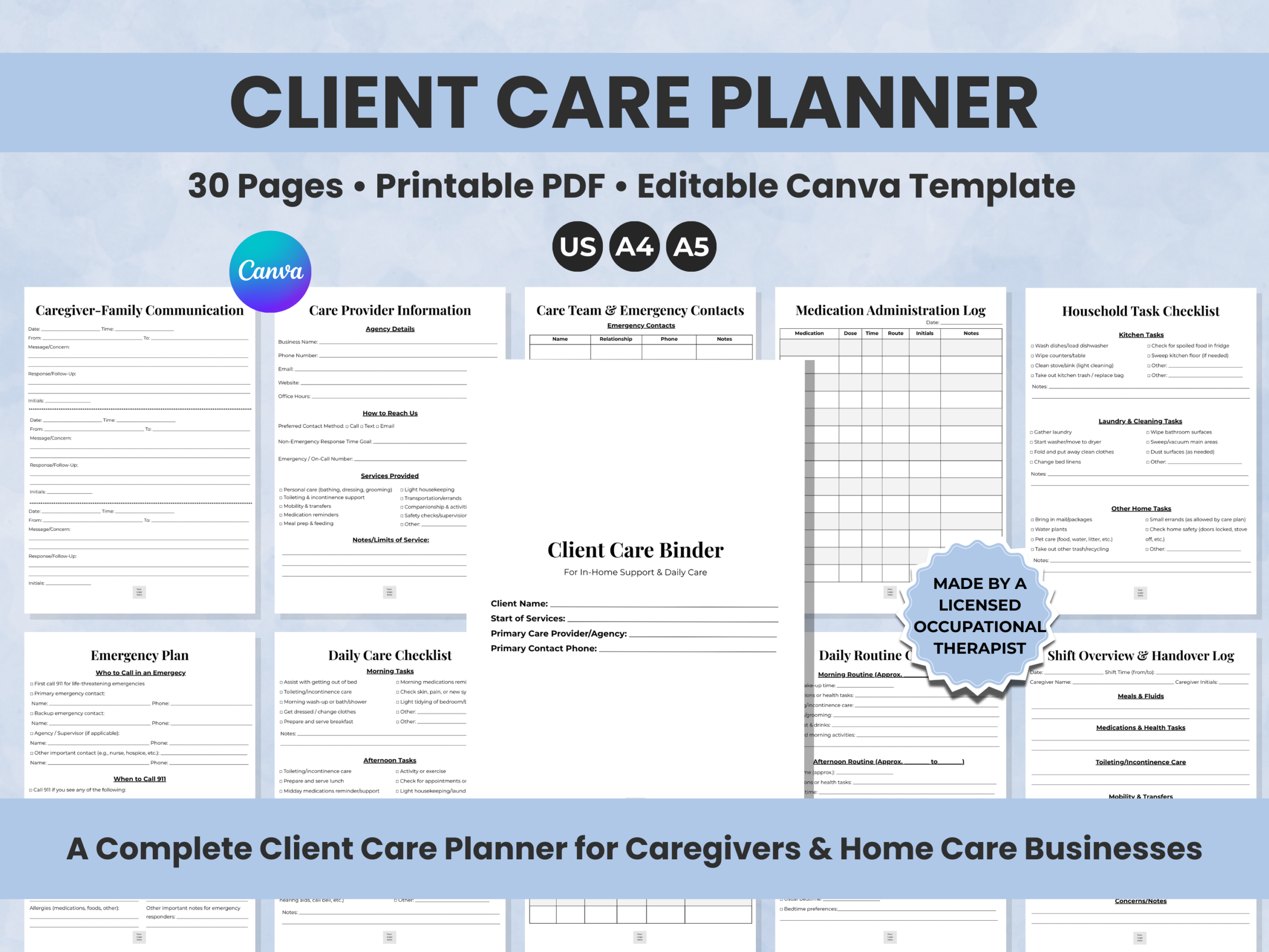 Client Care Planner Printable PDF & Canva Template — created by a licensed occupational therapist to support safe, organized, and consistent caregiving.