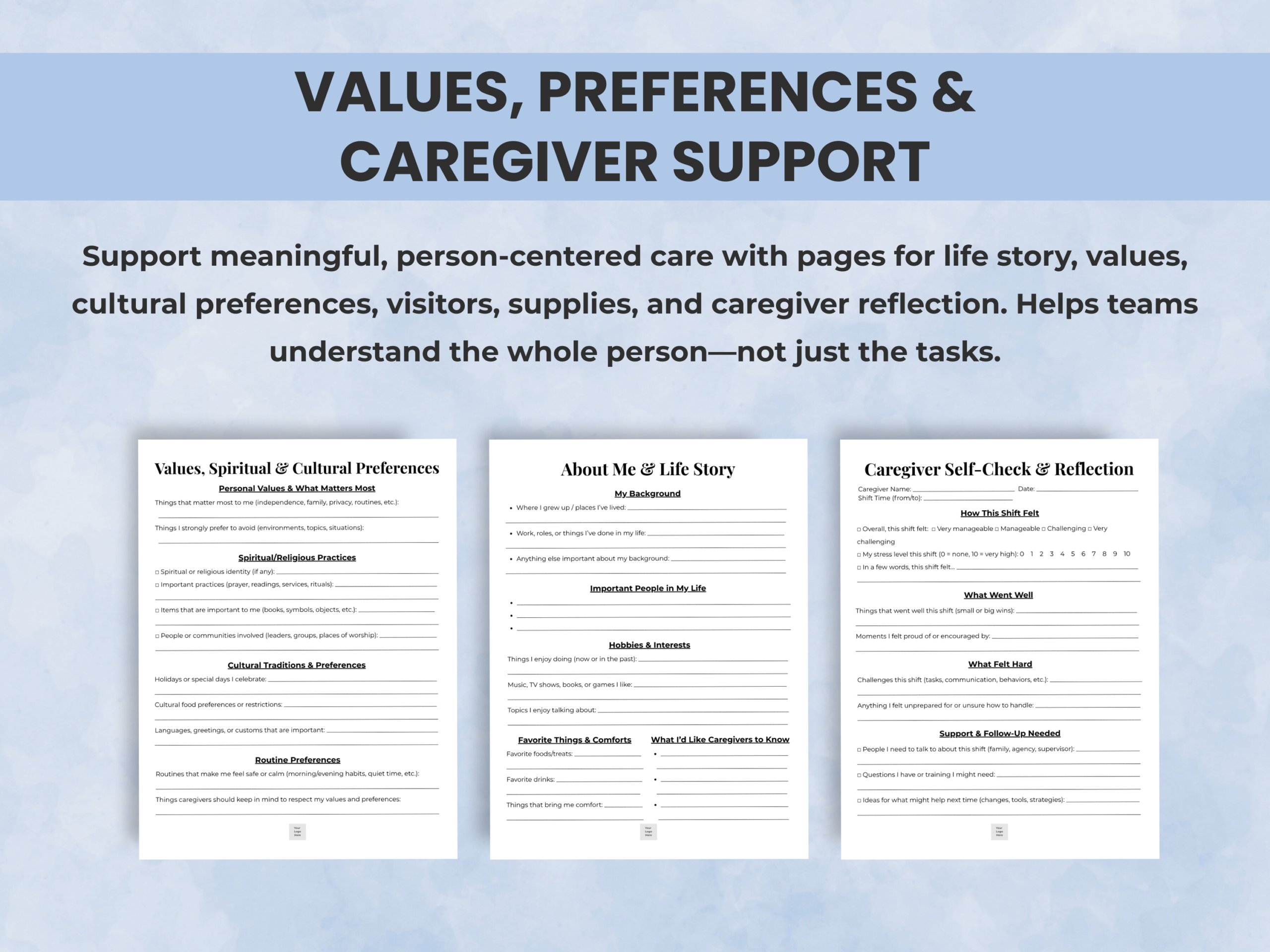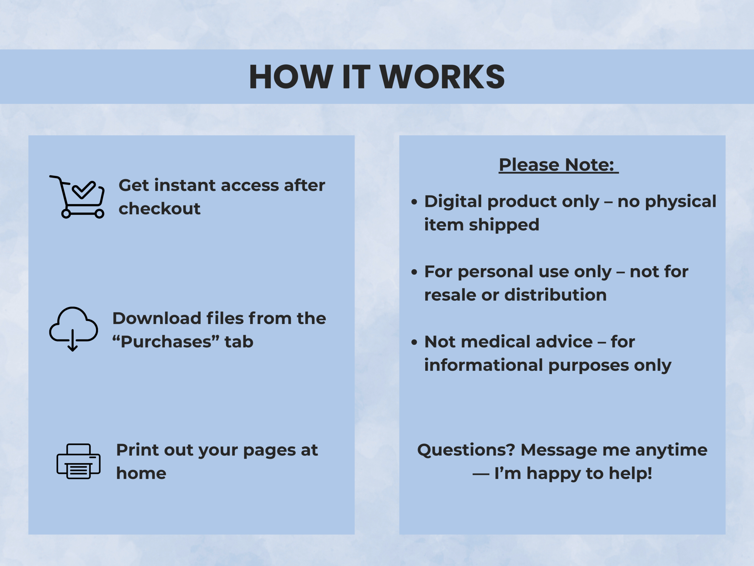 Purchase → Secure checkout via Etsy Download → Instant access to all files Print or Edit → Use as ready-to-go PDFs or customize in Canva Share with Care Team → Provide printed copies to caregivers or families