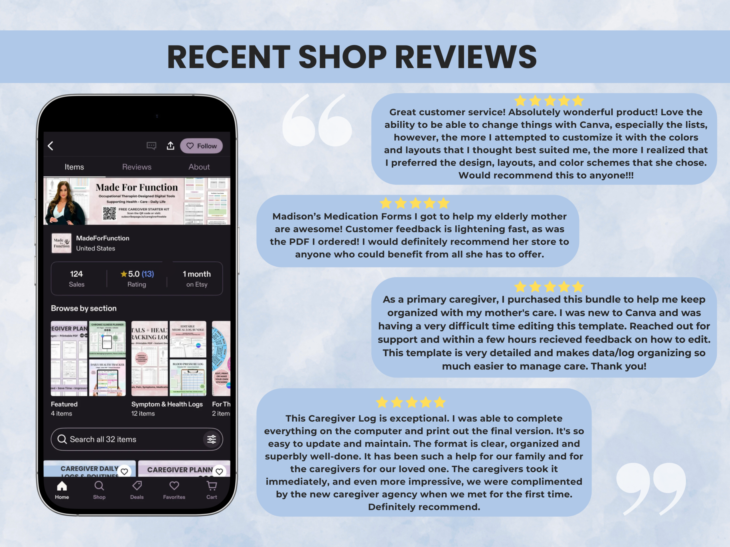 I’m Madison, a licensed occupational therapist with experience in neuro rehab, caregiving, and daily function across home and community settings. After working closely with families and private caregivers, I created this binder to simplify communication, improve safety, and make caregiving more organized, confident, and person-centered.