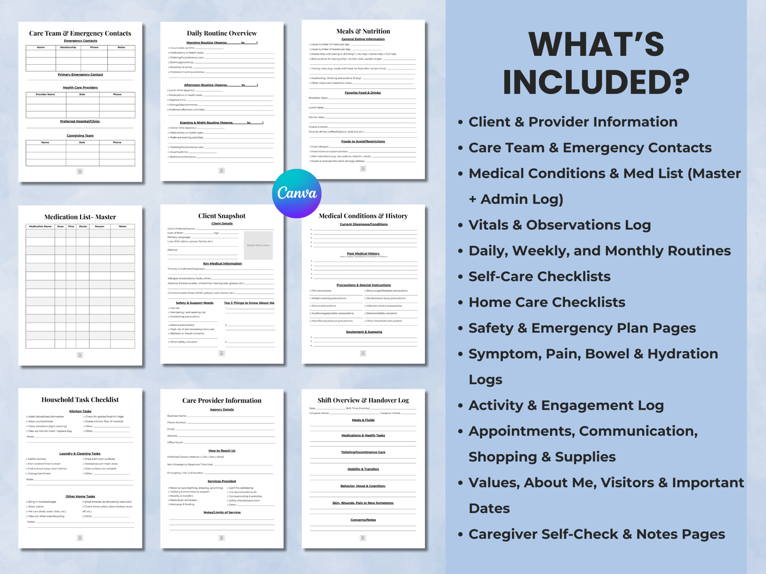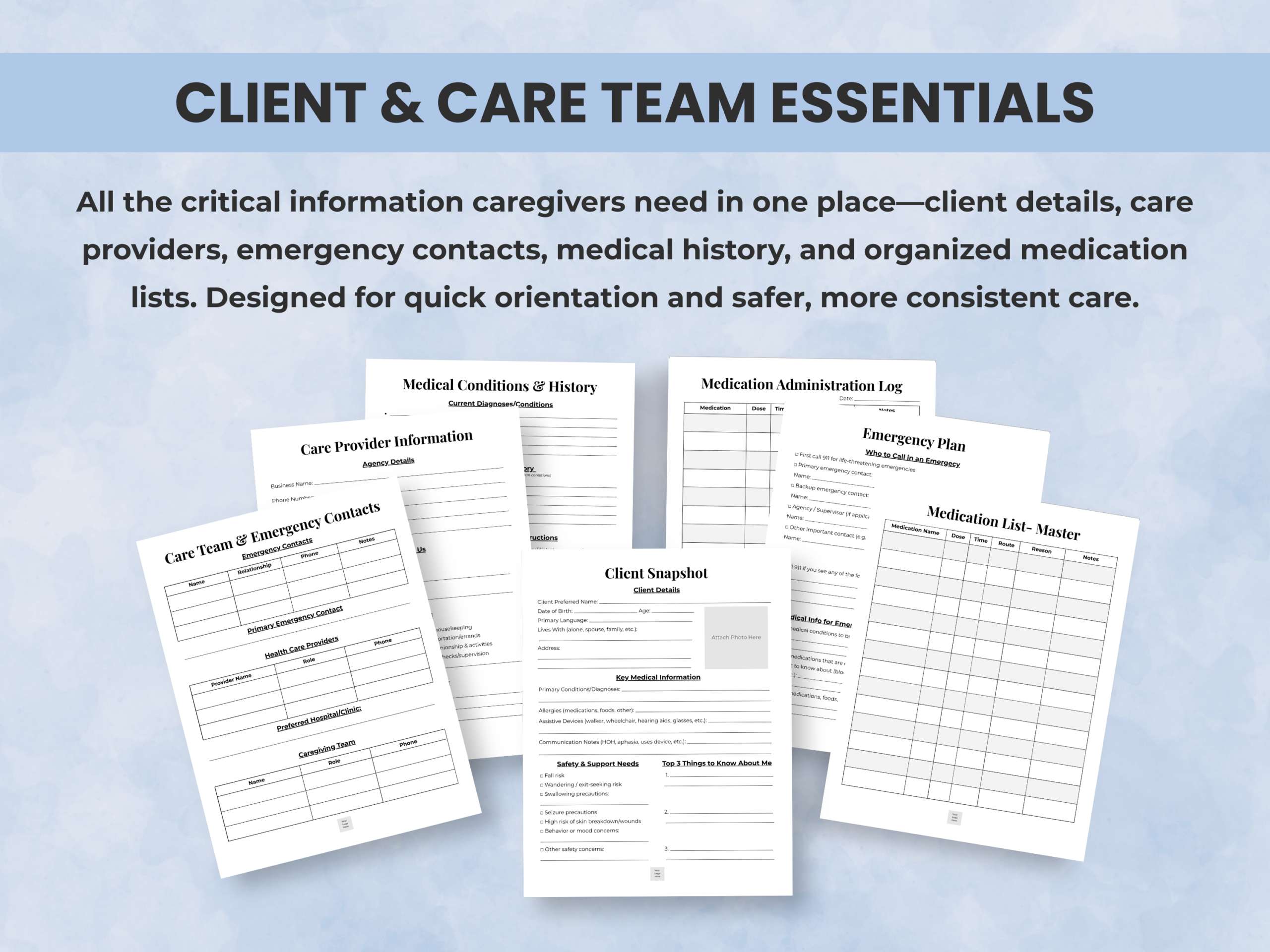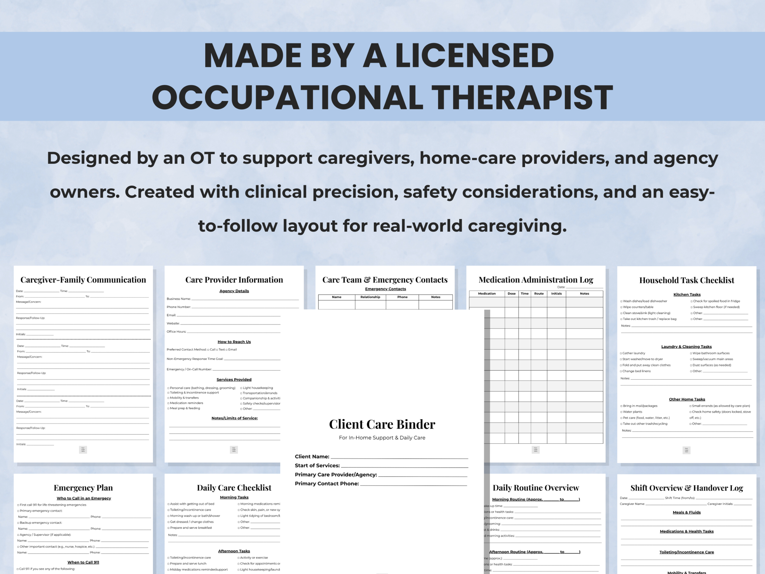 This professional caregiver binder helps families, private caregivers, and home-care agencies keep client information, routines, safety plans, medical details, and daily care tasks all in one place. Designed with OT expertise to improve communication, reduce errors, and support high-quality, person-centered care.