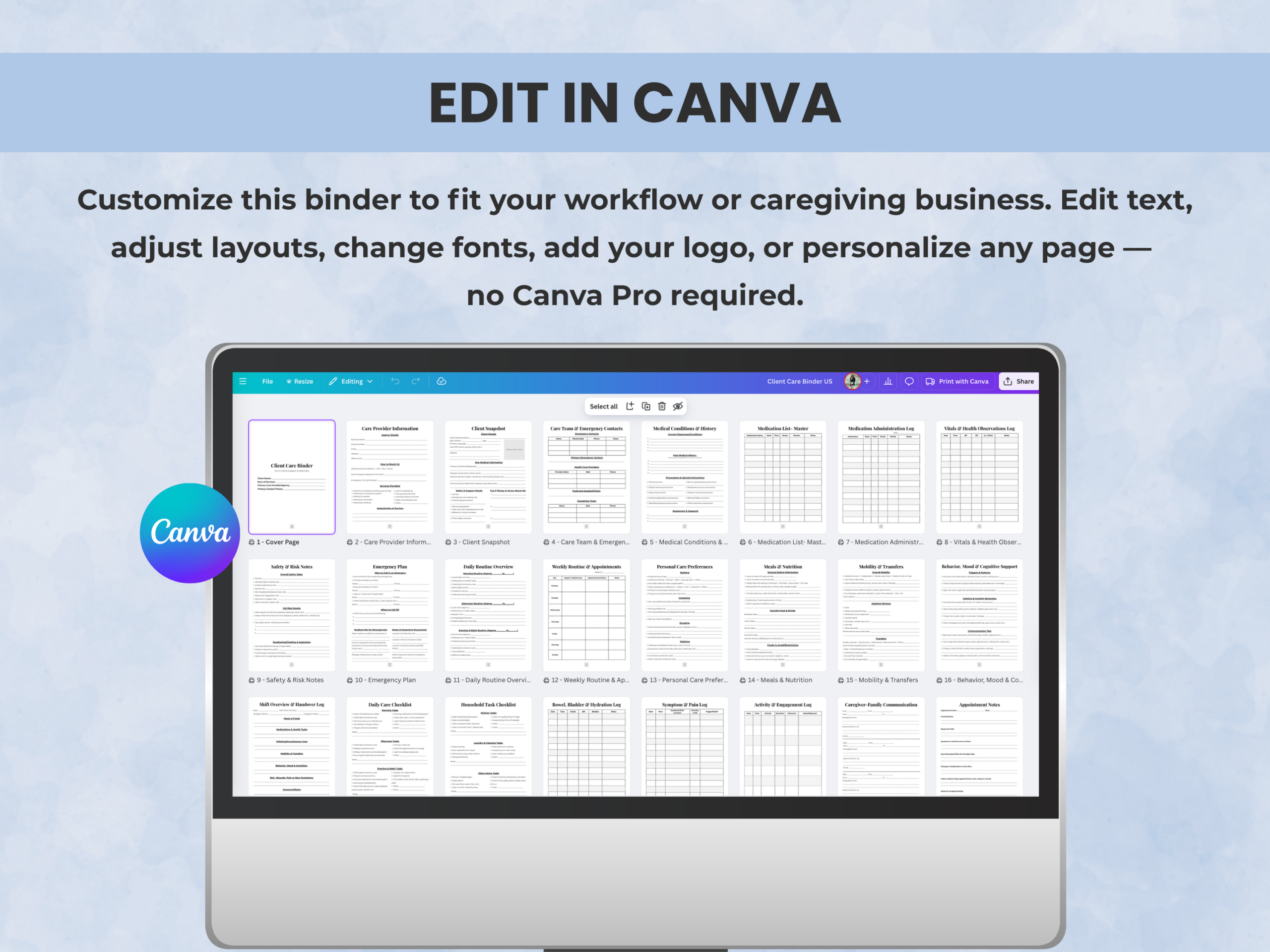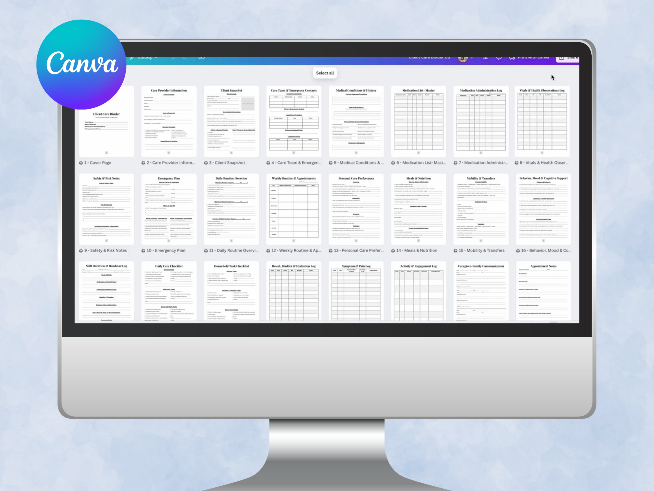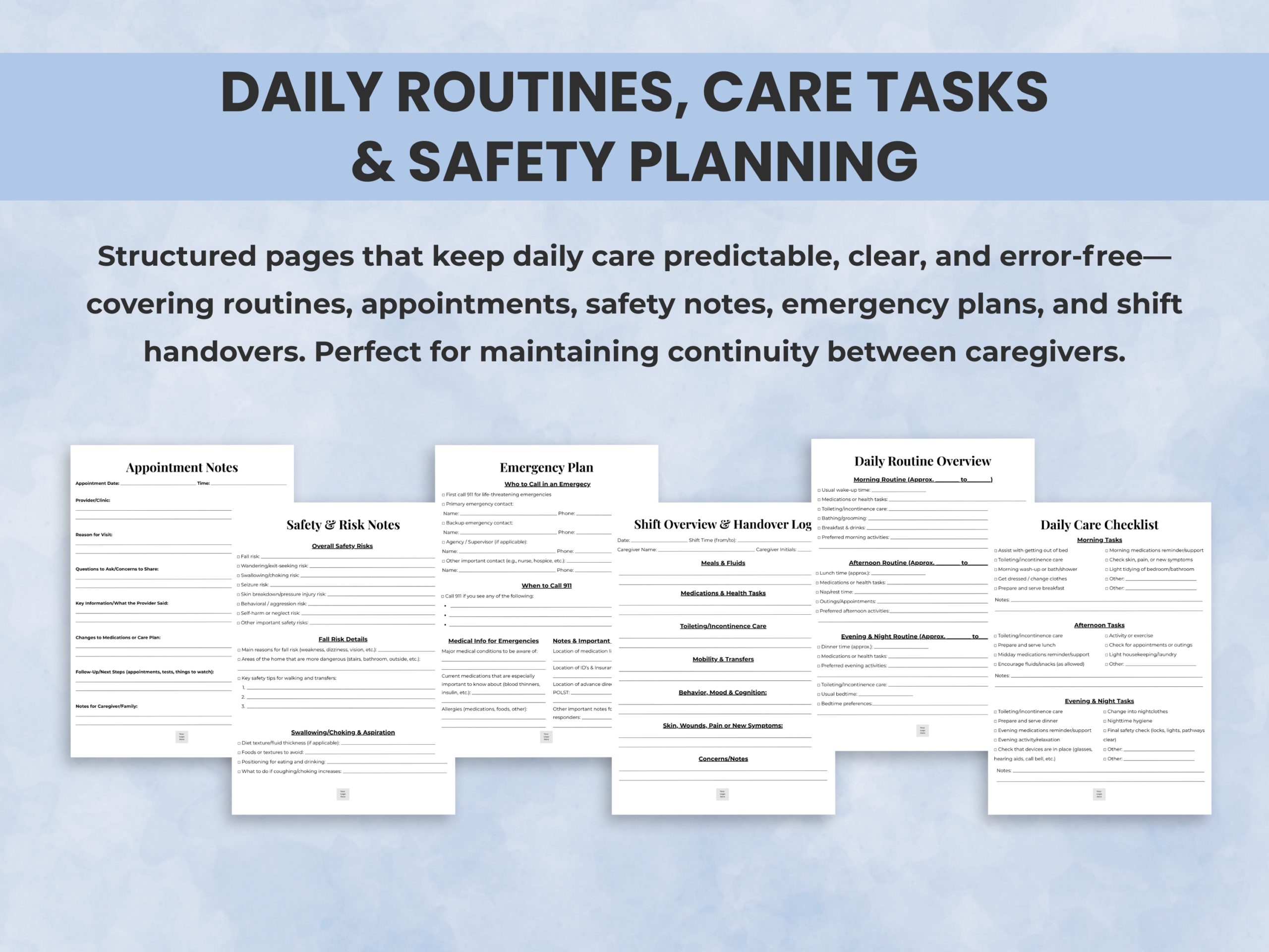 This professional caregiver binder helps families, private caregivers, and home-care agencies keep client information, routines, safety plans, medical details, and daily care tasks all in one place. Designed with OT expertise to improve communication, reduce errors, and support high-quality, person-centered care.