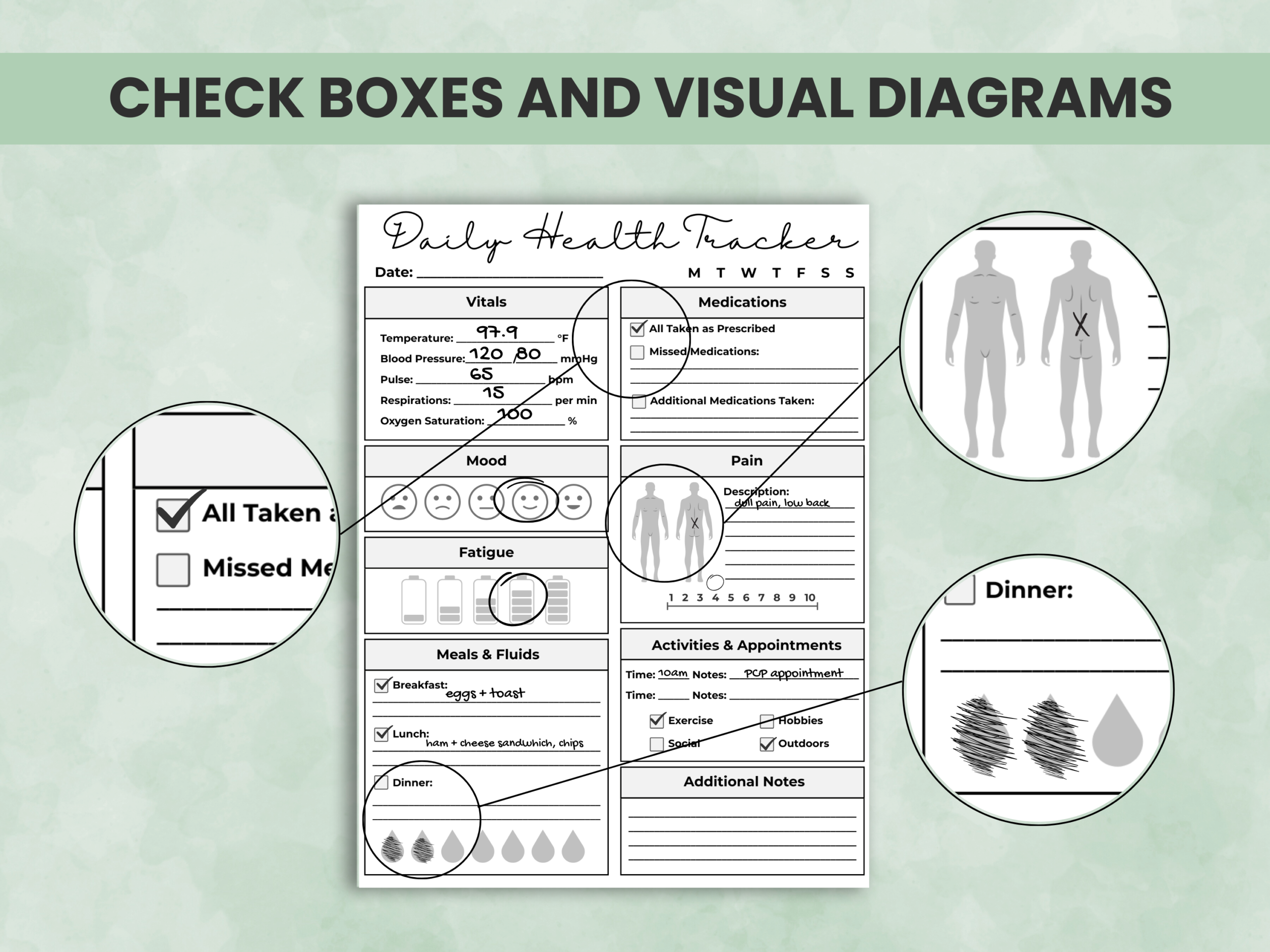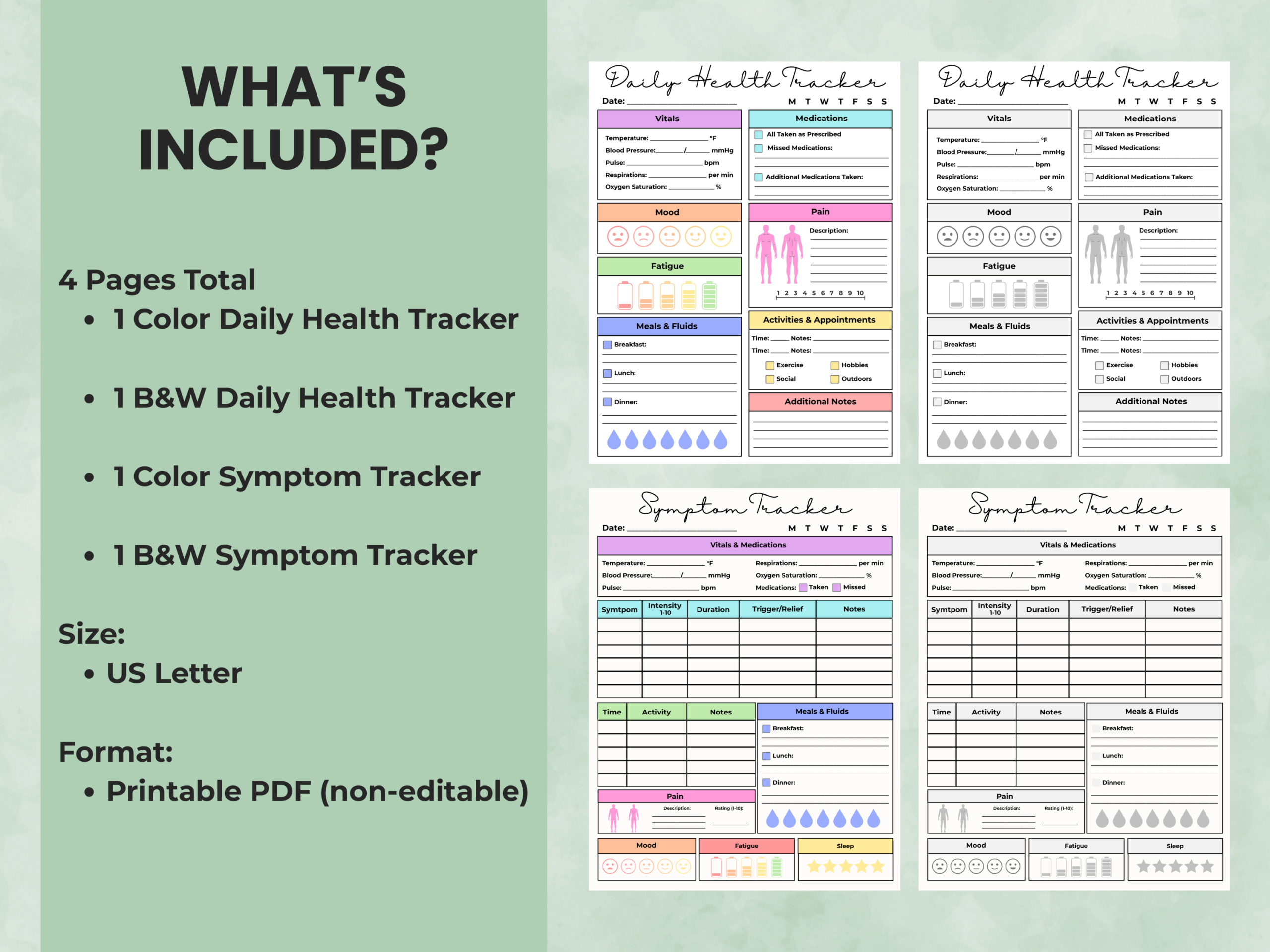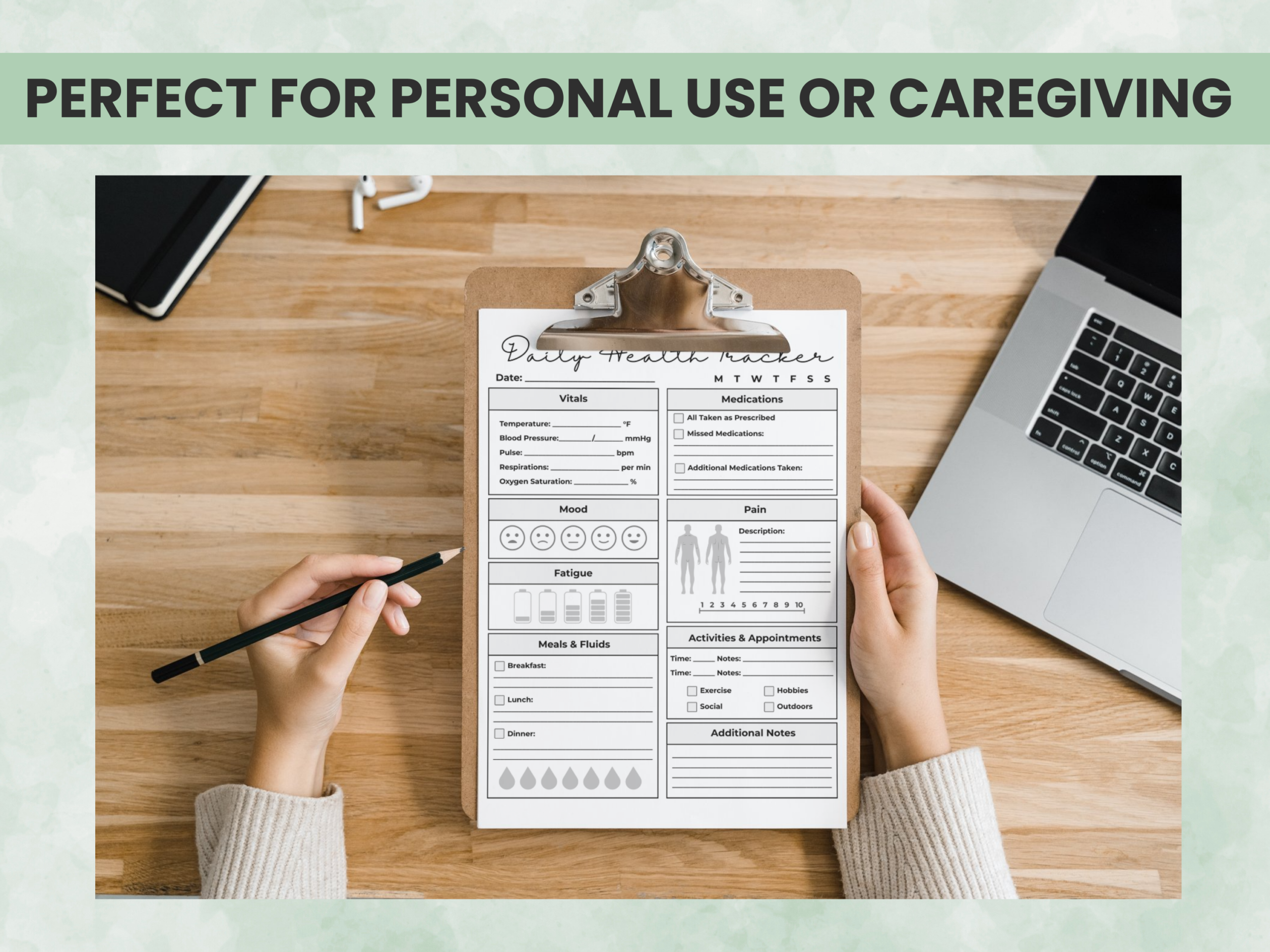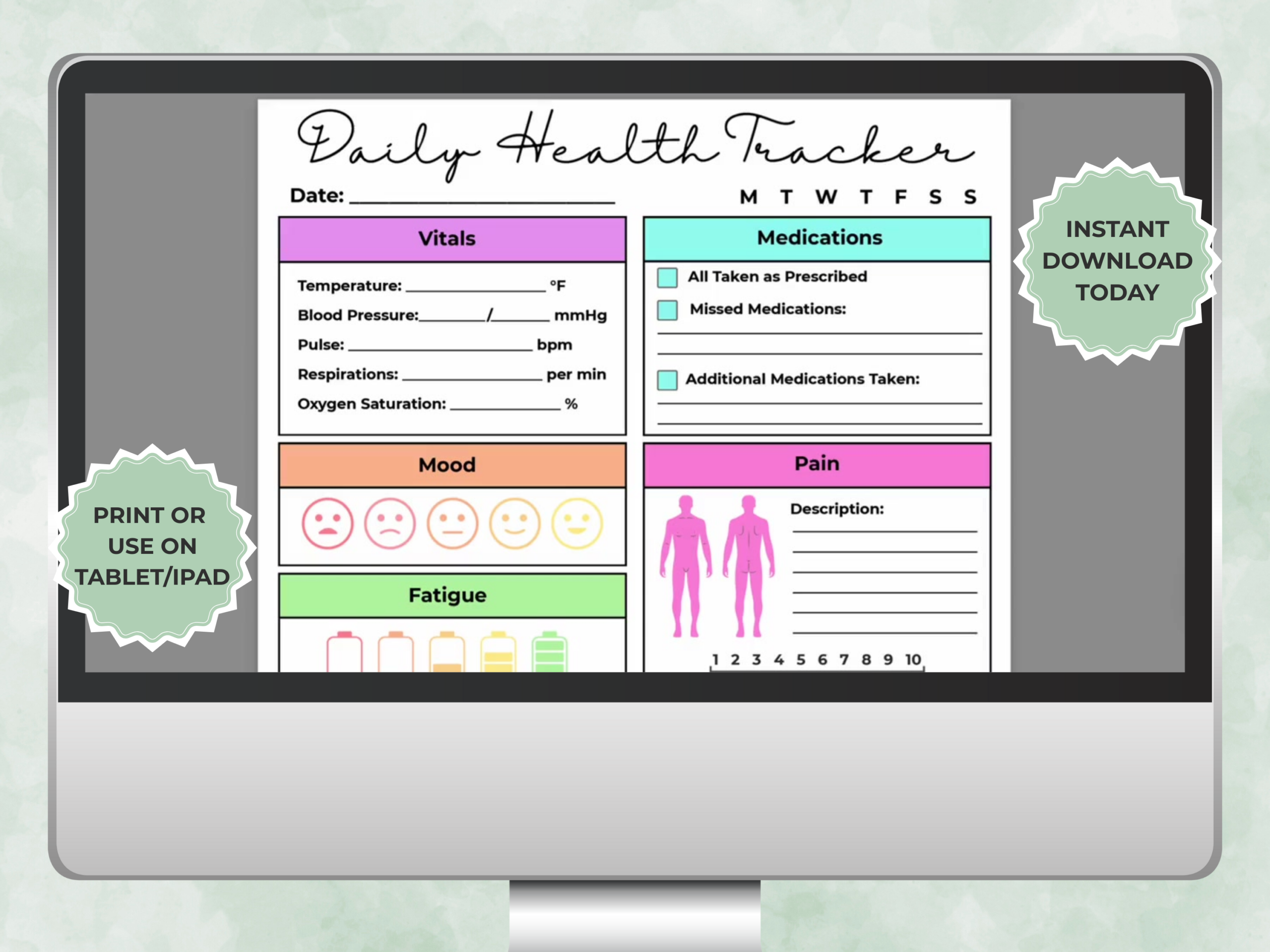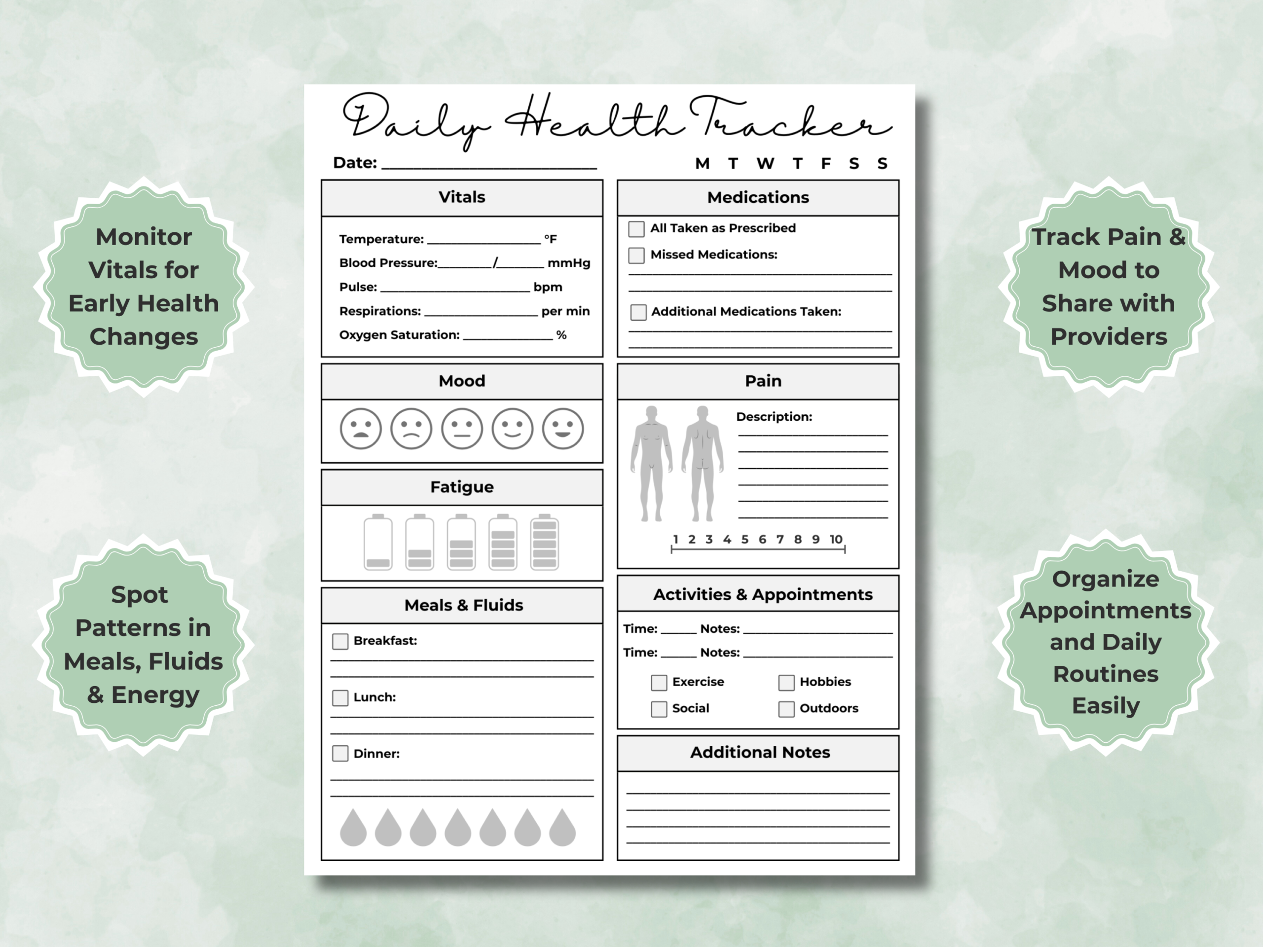 This printable health journal helps you stay consistent with tracking vitals, medications, mood, pain, fatigue, and daily activities — all in one place. Great for chronic illness management, wellness routines, therapy, and self-monitoring.
