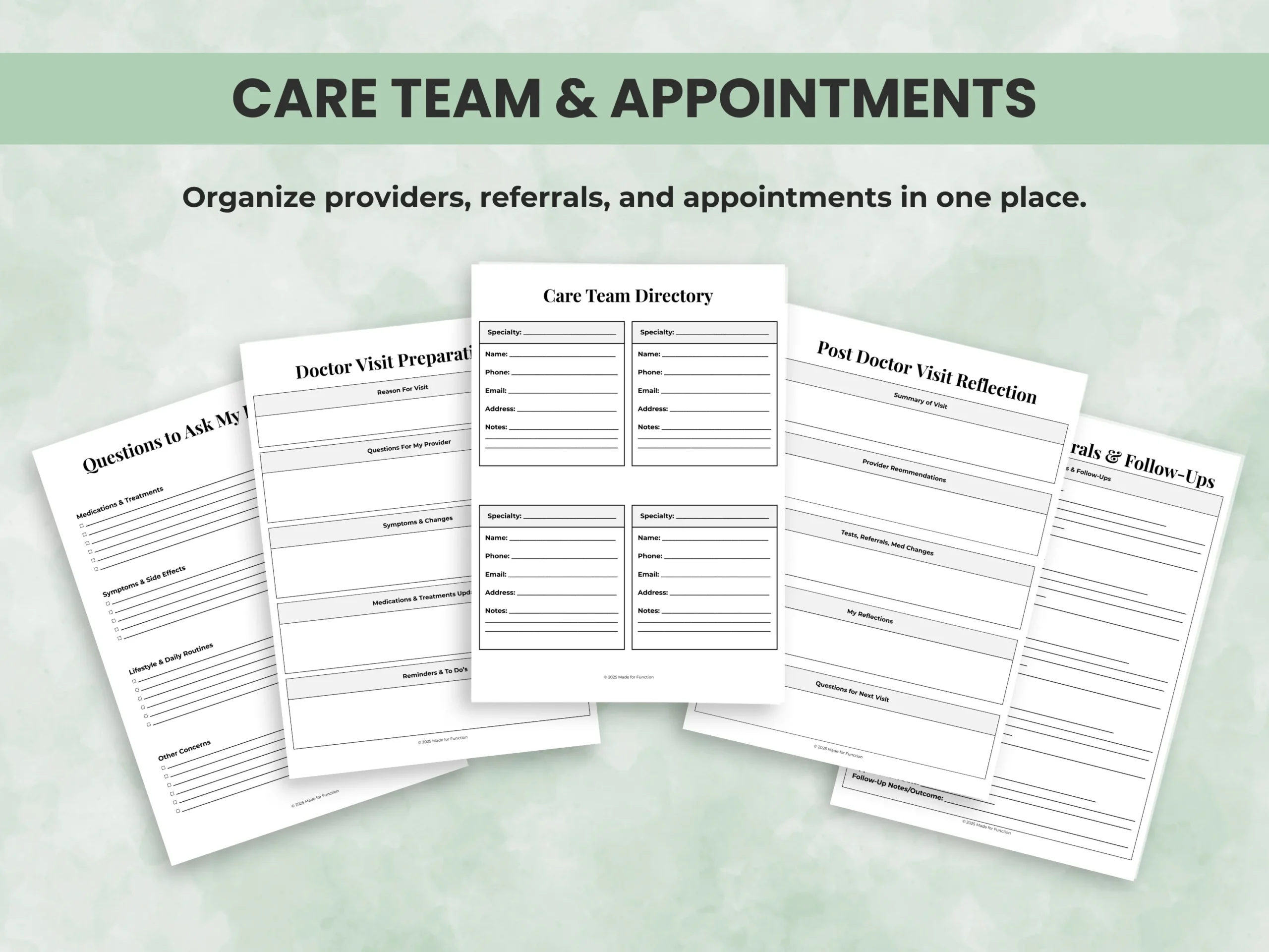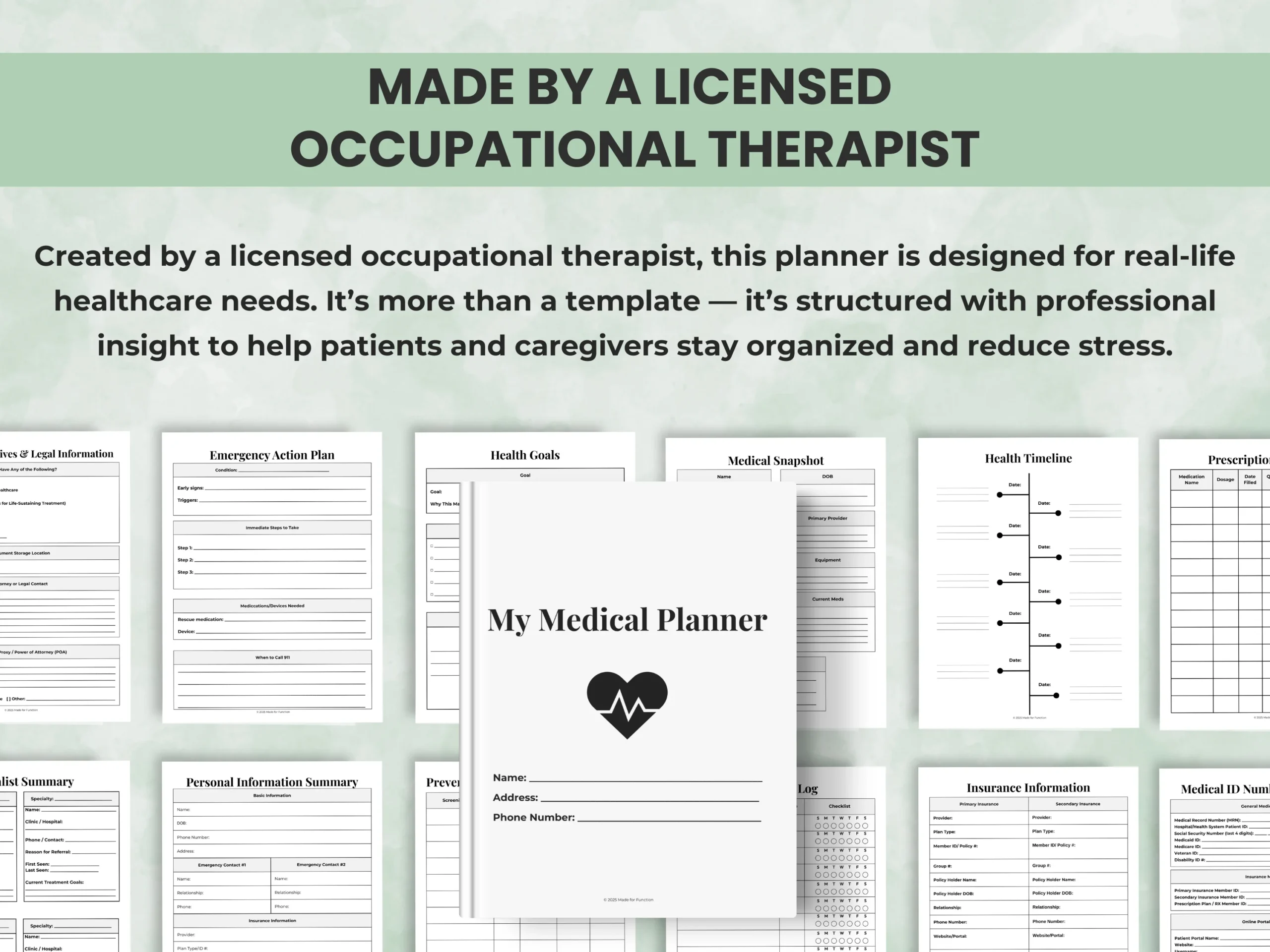 I’m Madison, a licensed occupational therapist with experience supporting people living with chronic illness and their caregivers. I know how overwhelming scattered health records and unorganized appointments can be. I created Made for Function to provide practical, therapist-designed tools that reduce stress and help patients and families feel more confident and prepared.