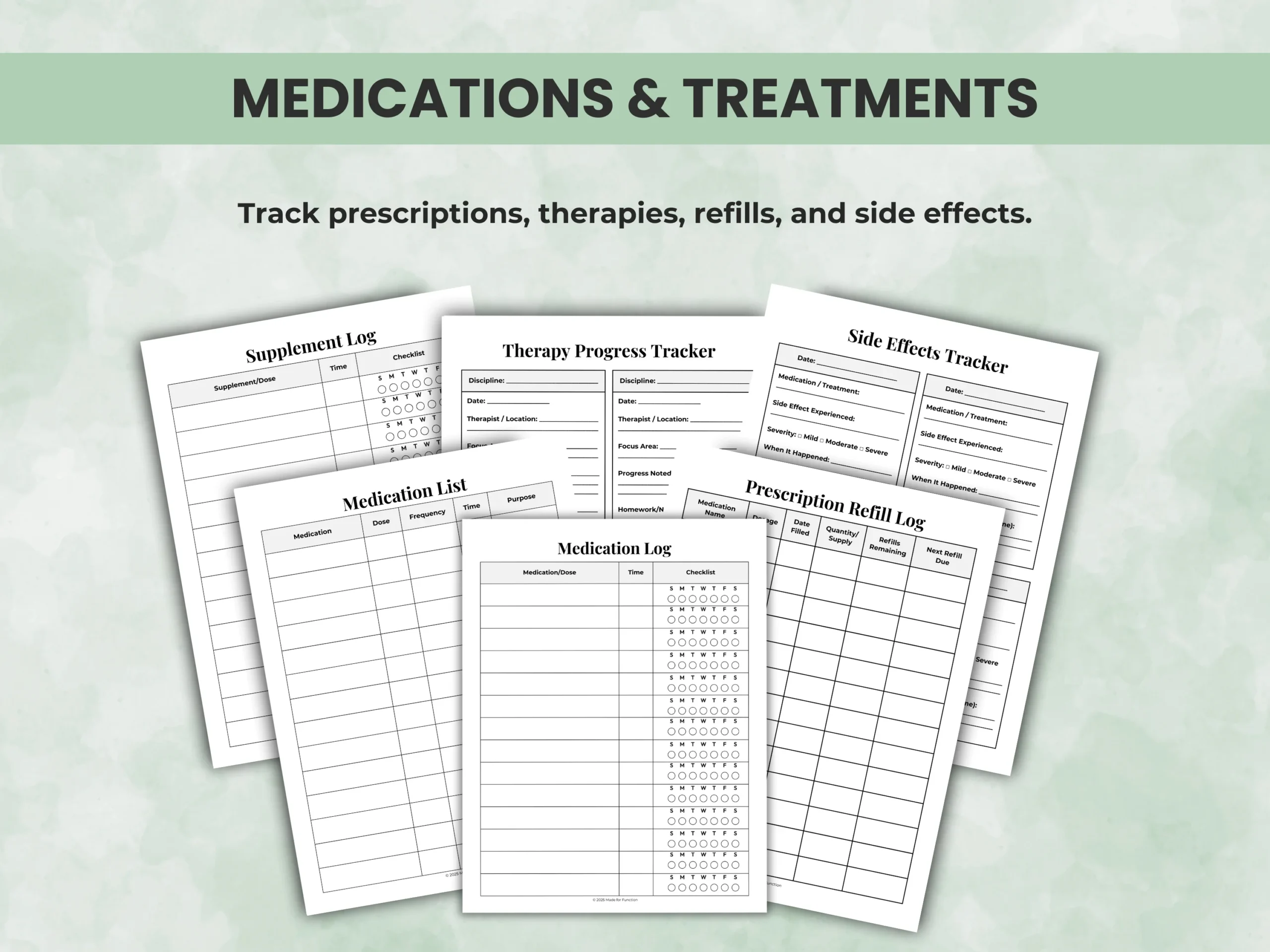 • Medications & Treatments (medication list, refill log, side effect tracker)