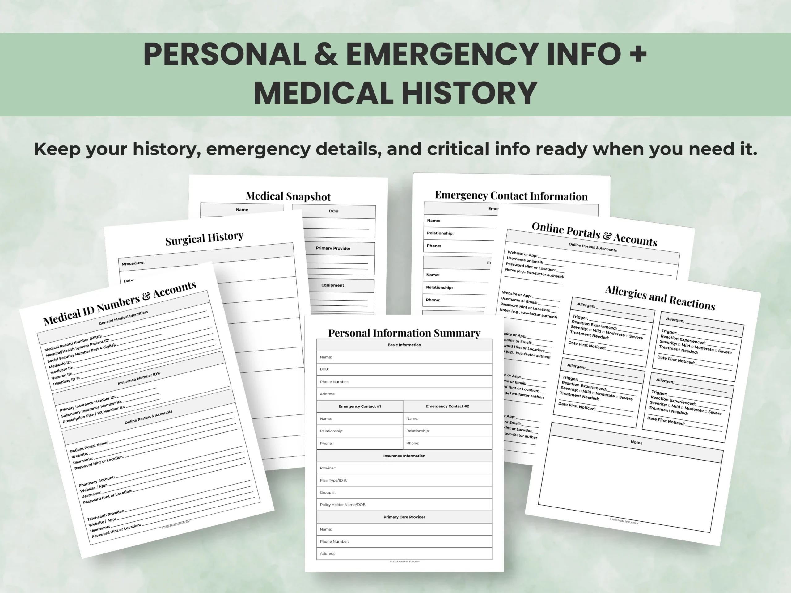 This printable and editable medical planner helps you organize your health information in one place — from medical history and records to symptoms, appointments, and daily health logs. It’s perfect for chronic illness management, caregiving, or anyone who needs a clear, structured system for keeping medical details organized.